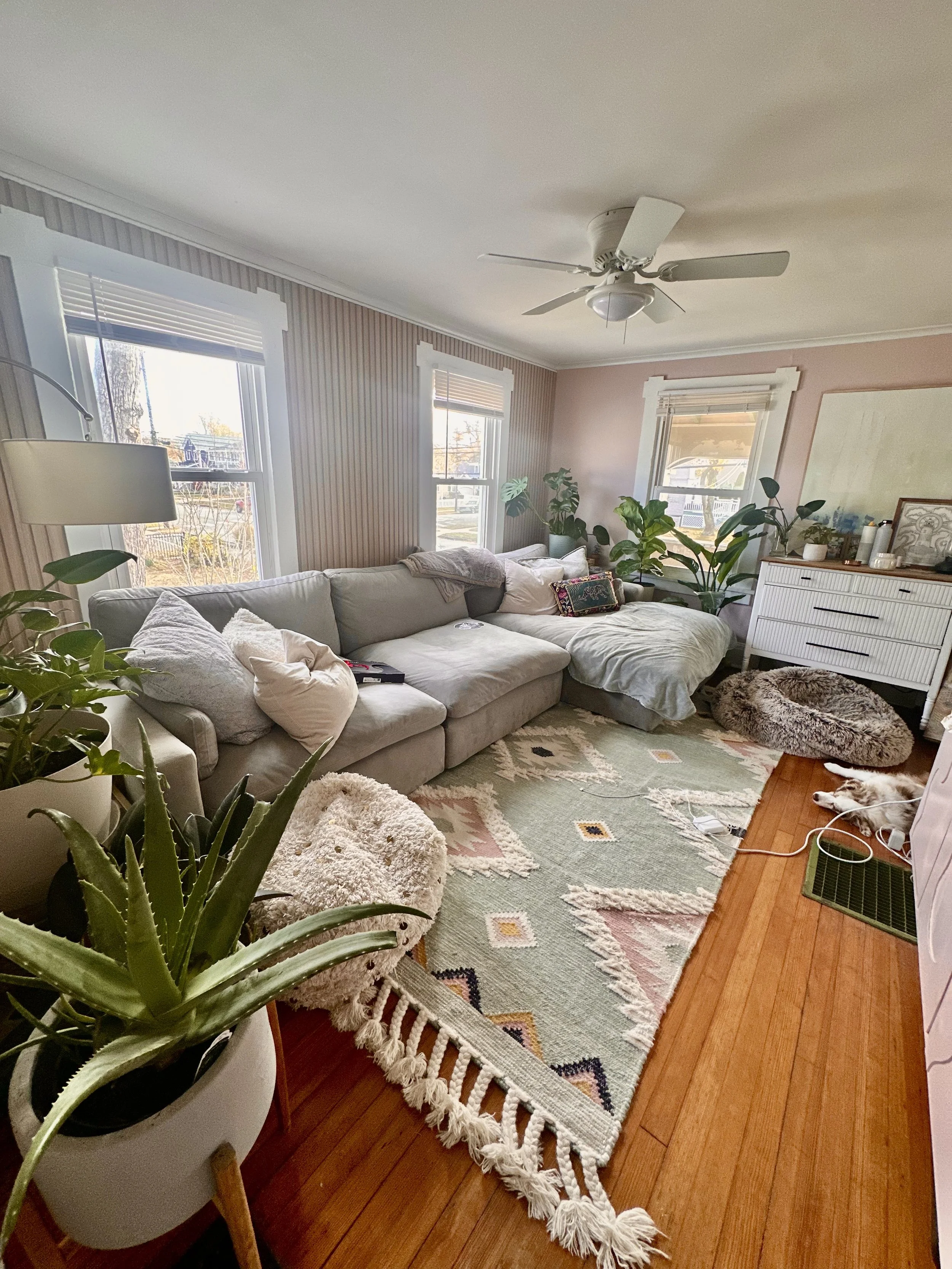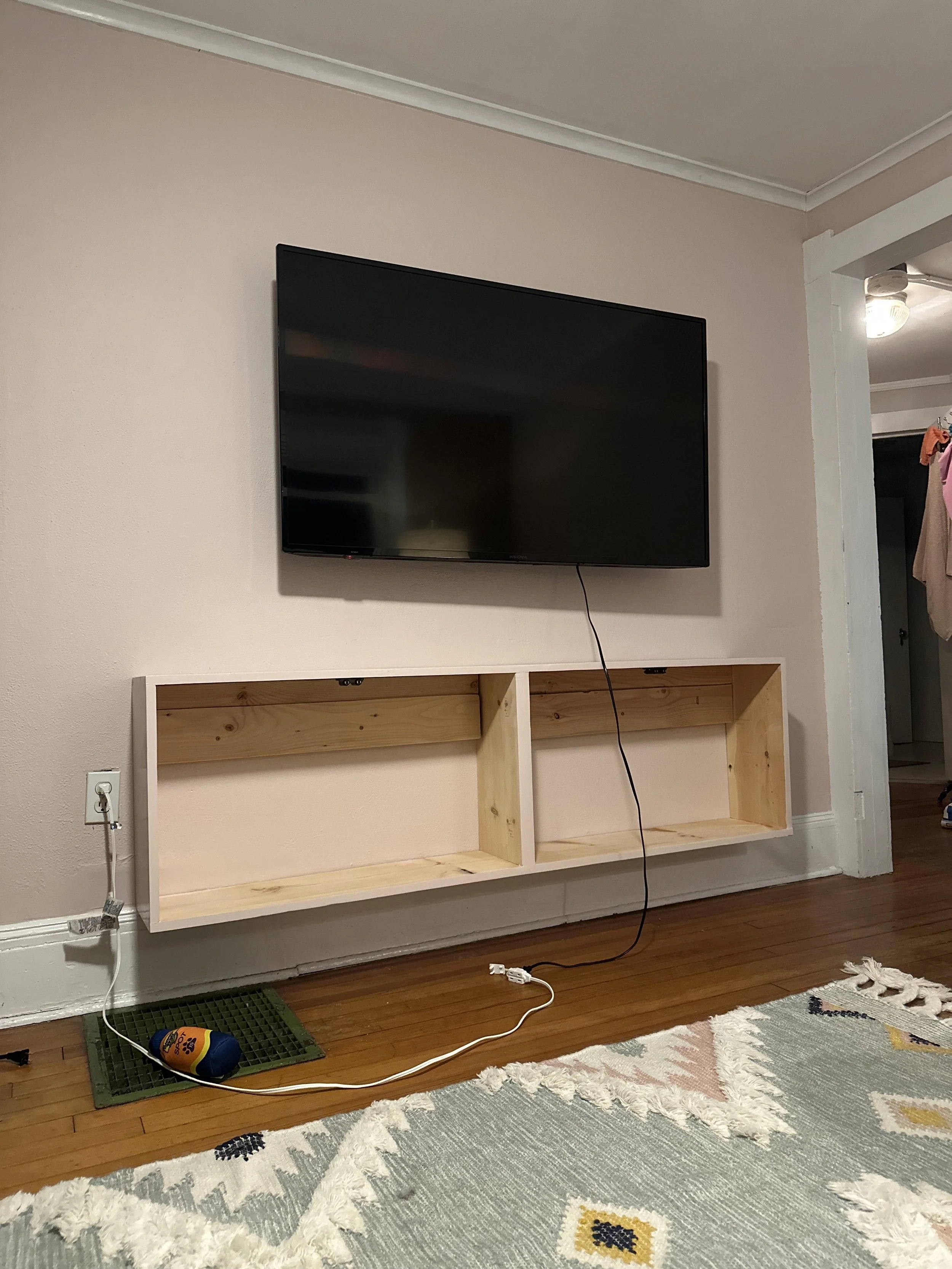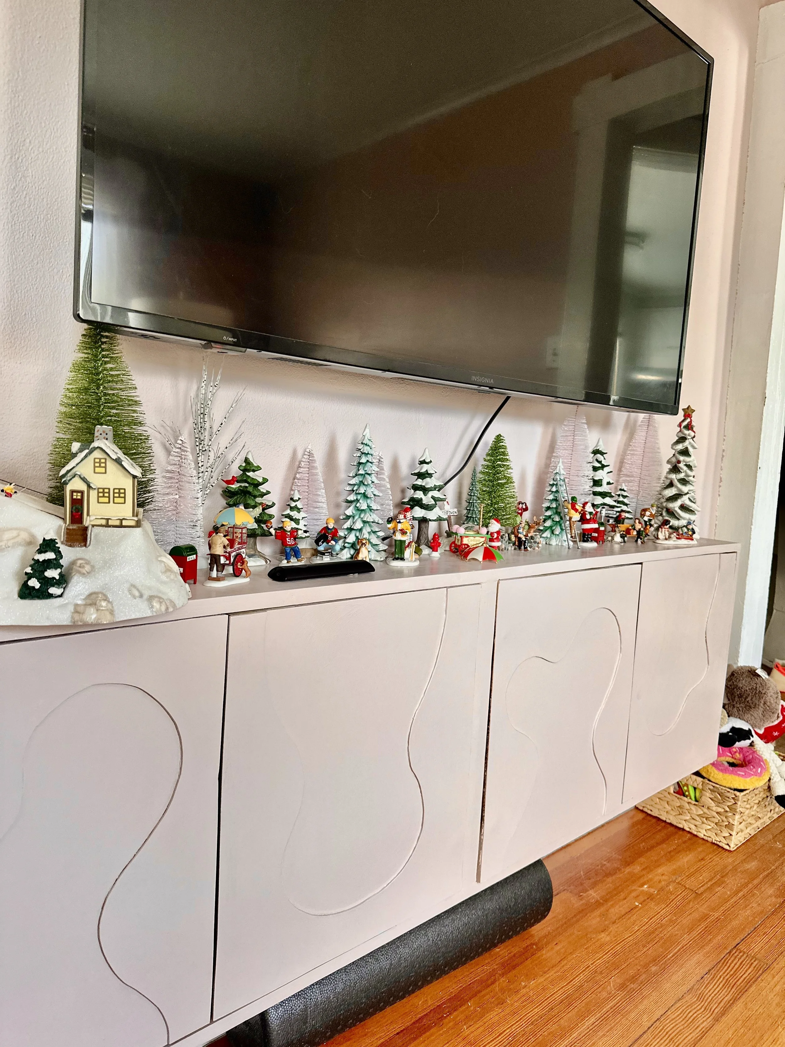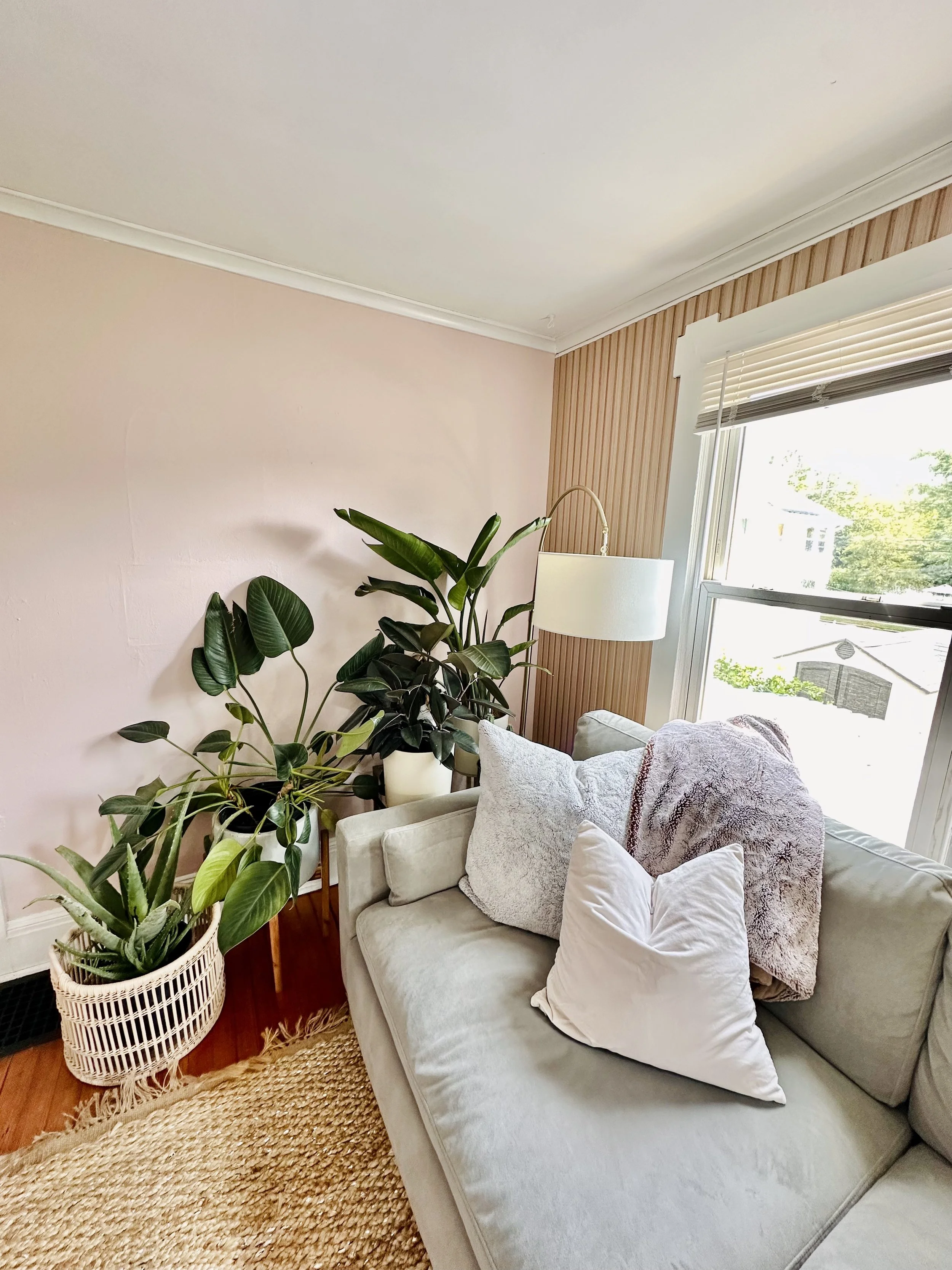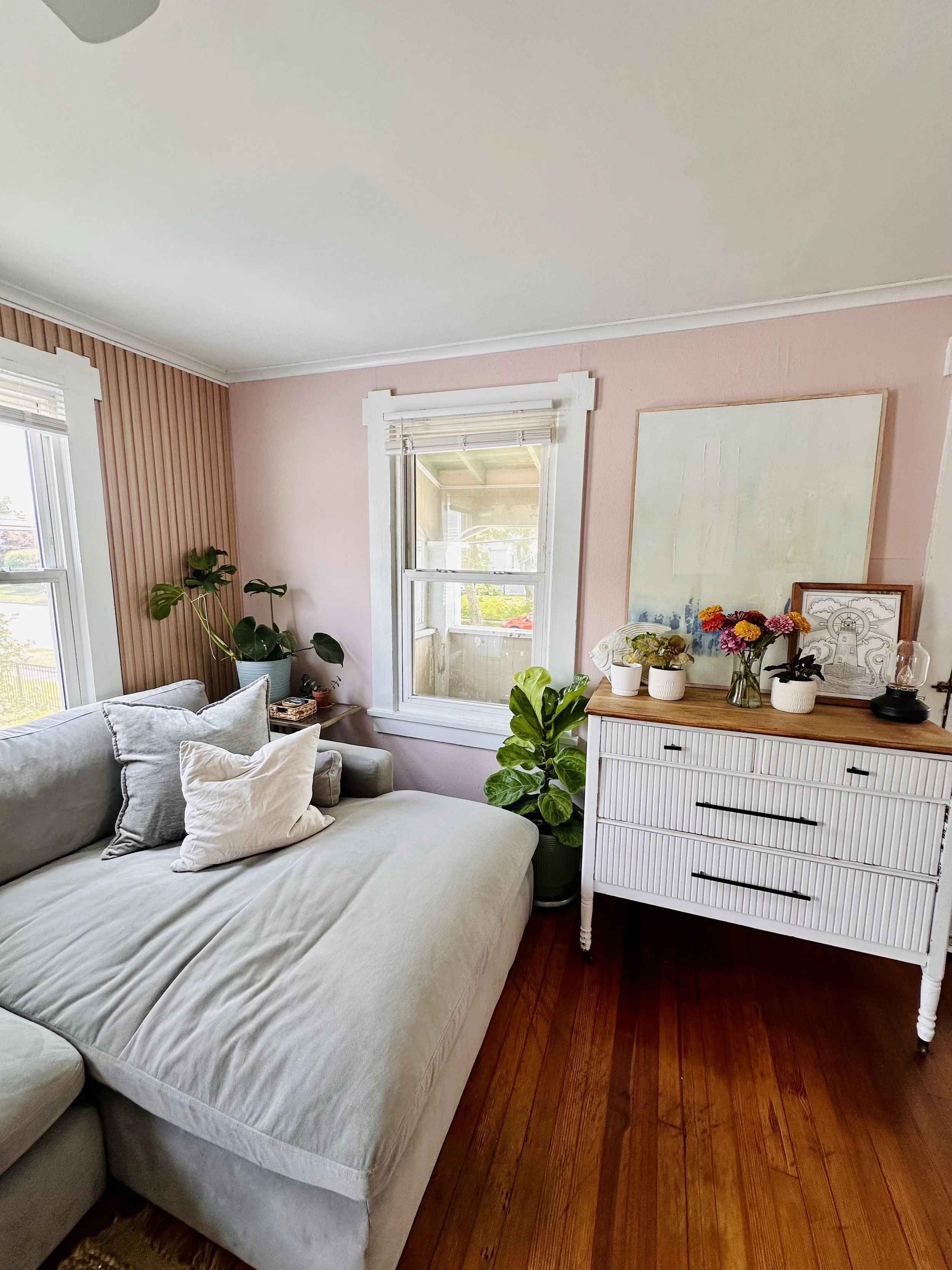 When I first moved in, the house needed a lot of work, and the living room wasn’t quite my style. For the time being, we painted the walls a neutral color and moved in some furniture I already had. A few years later, I decided to upgrade the space and turn it into a girly, pink, plant-filled zen retreat. I built a custom cabinet under my TV, as I couldn’t find anything in my budget that fit my vision. It was a fun learning experience, and I’m excited to create more custom pieces for my home in the future.