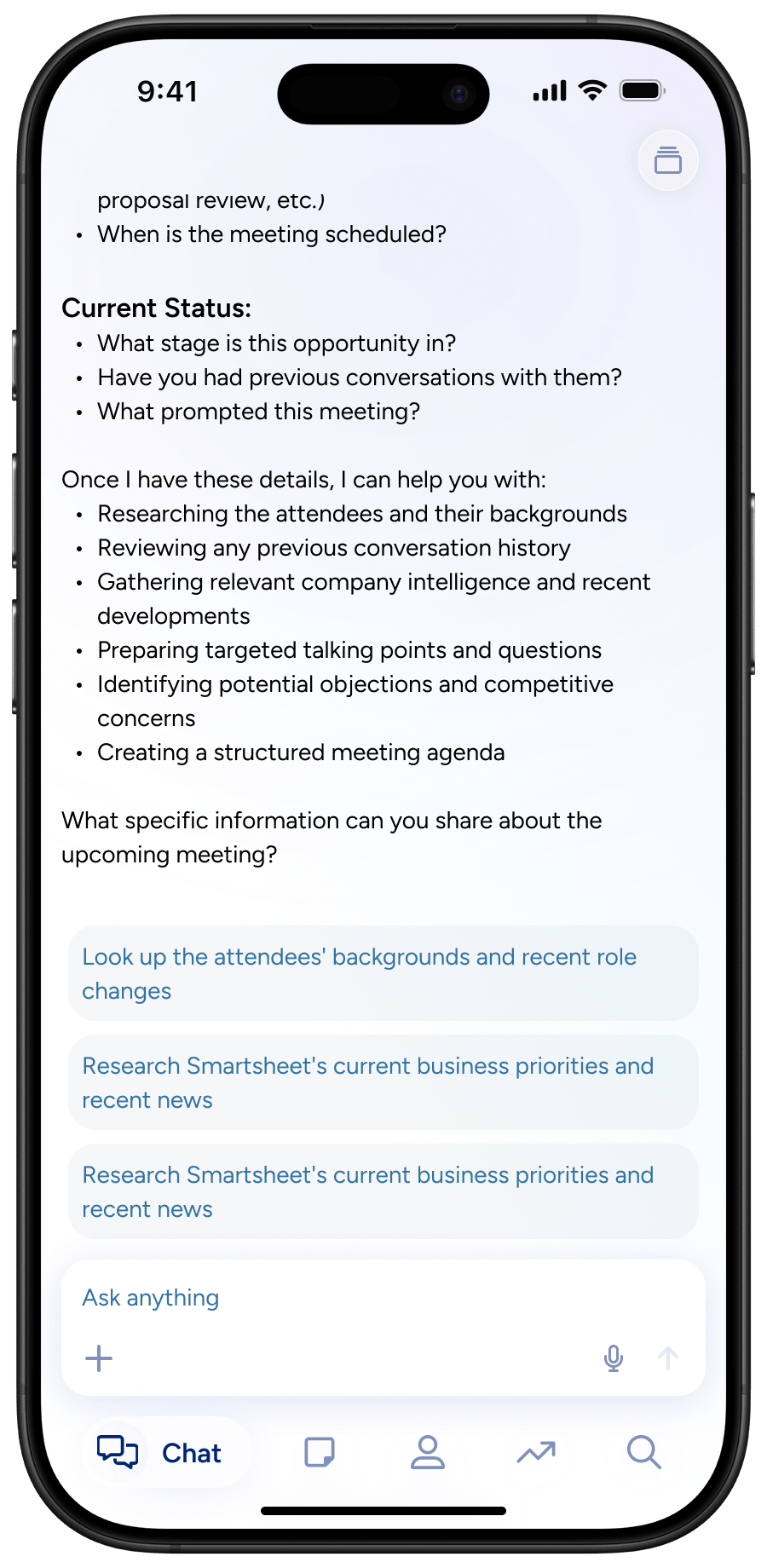 Automated meeting prep with account context and insights