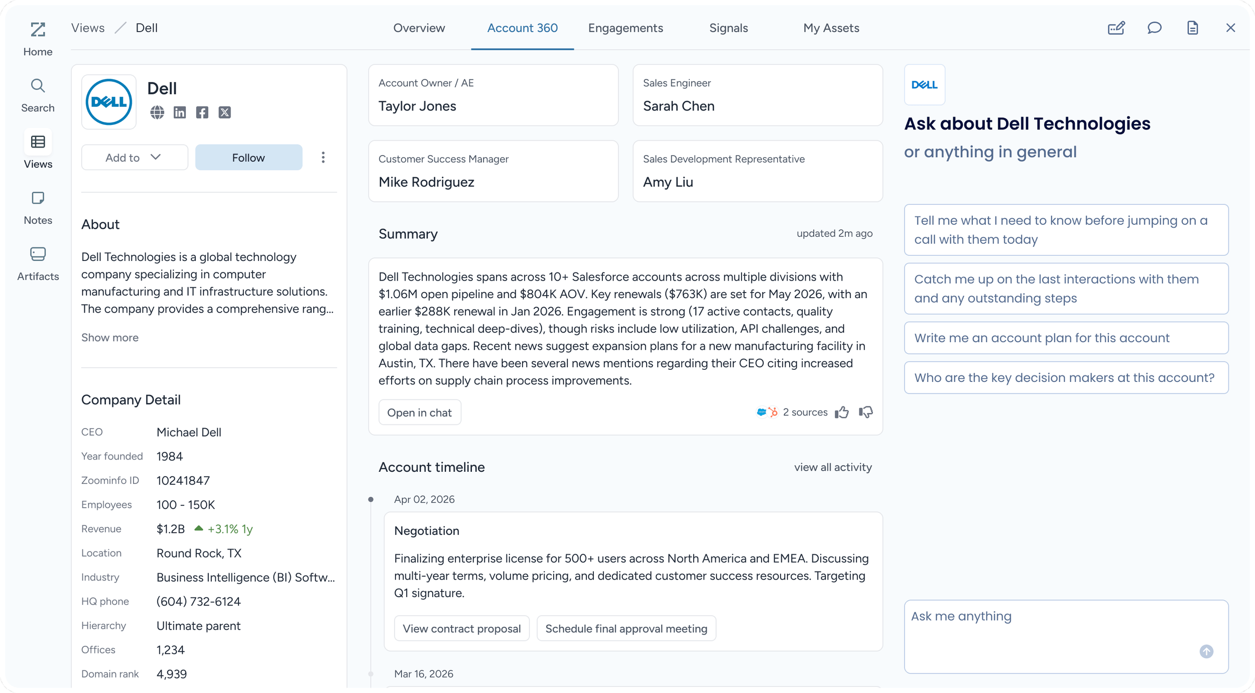 The platform connects previously siloed systems and layers AI on top to surface the highest-priority accounts, automate research, and guide sellers on what to do next. Instead of jumping between tools, reps can prepare for meetings, update deals, and take action directly within a single workspace.