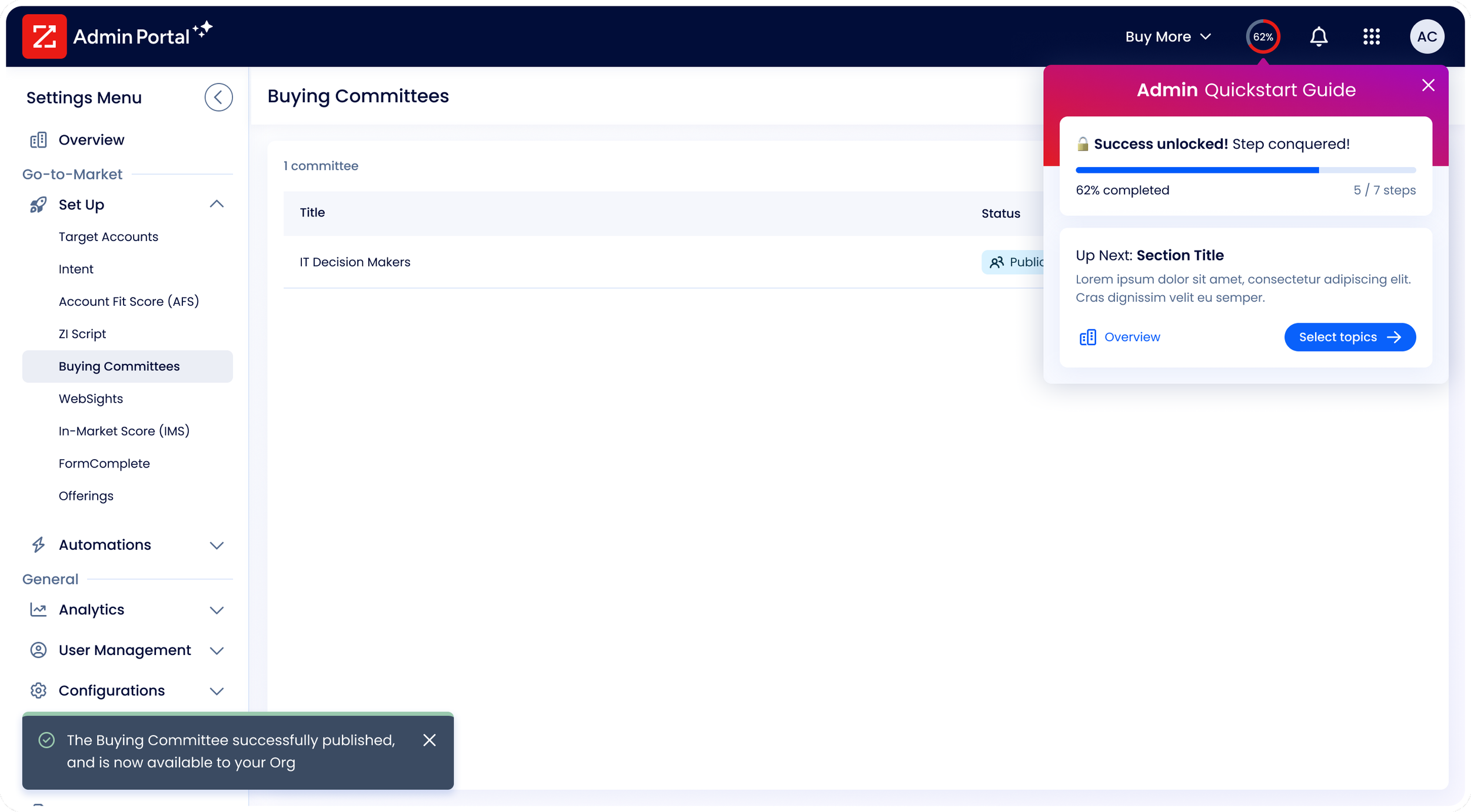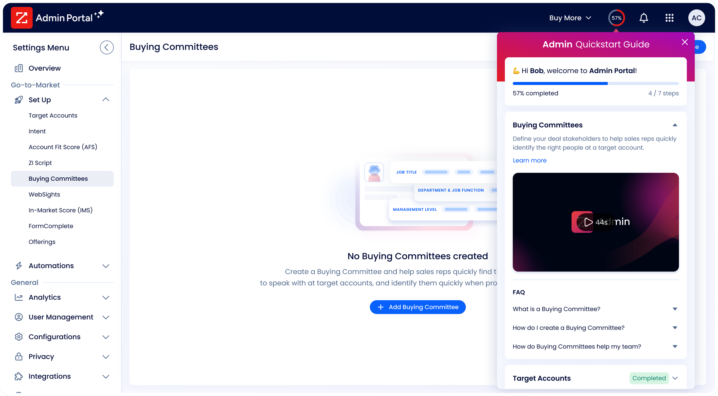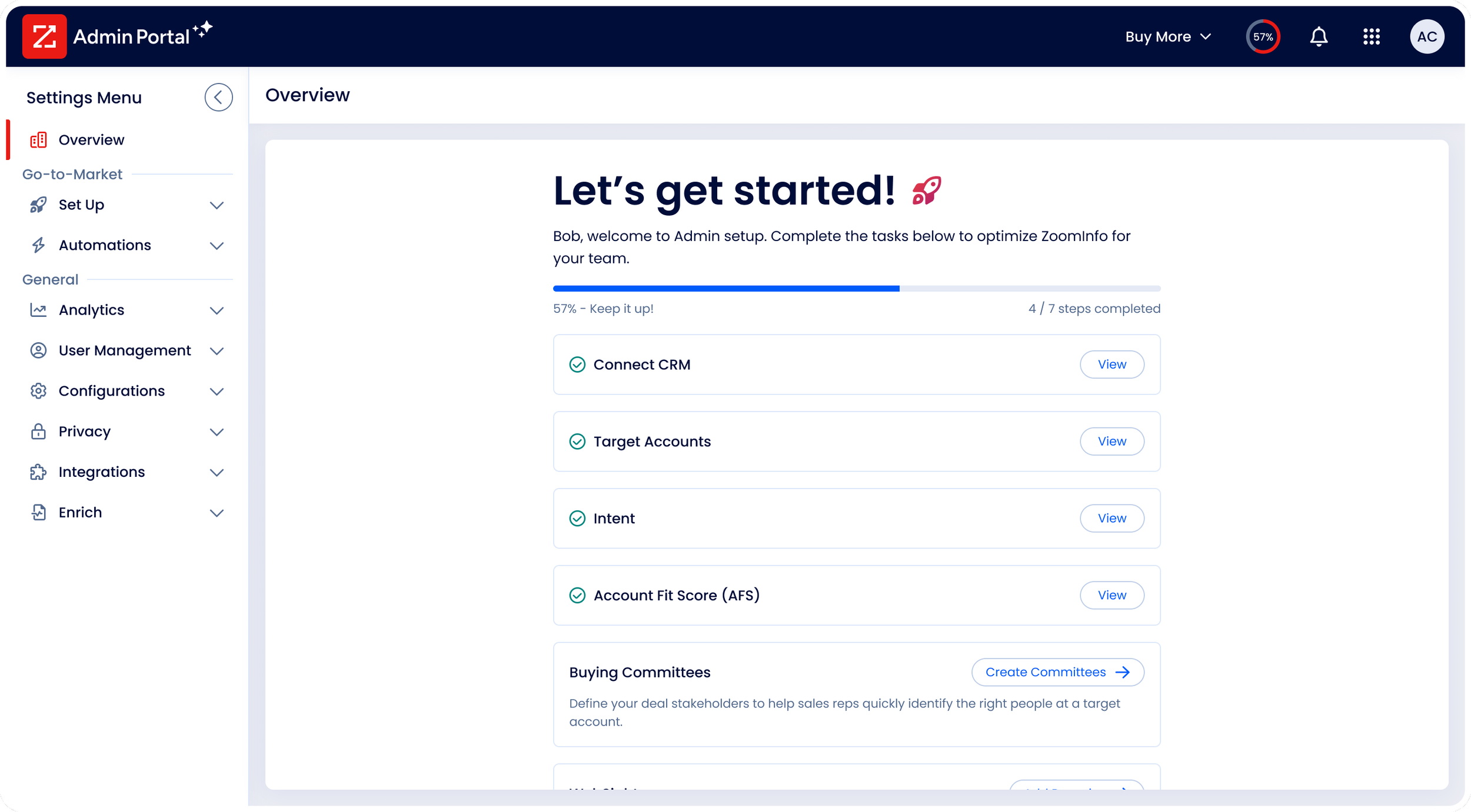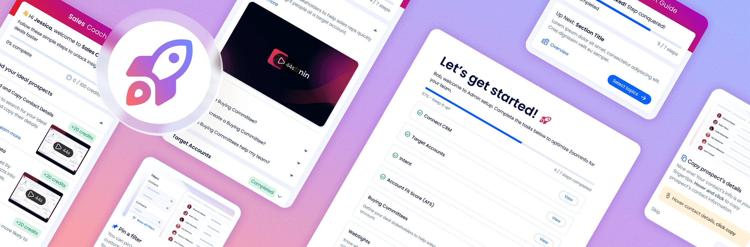ZoomInfo's onboarding redesign introduced a unified, guided onboarding experience across the Sales and Admin platforms.